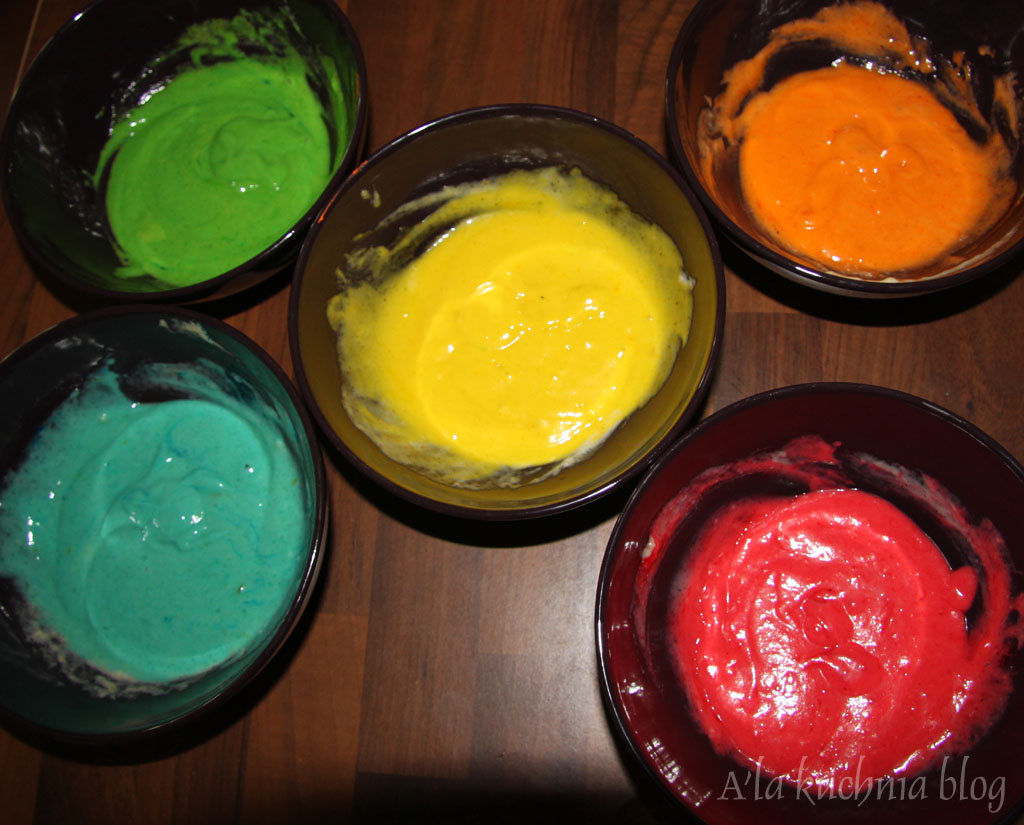 Wymieszać ze sobą osobno składniki suche i mokre, poczym je połączyć. Podzielić masę na 5 części, przekładając każdą do osobnej miseczki. Do każdej miseczki dodajemy odrobinę barwnika- ja miałam barwniki w proszku, ale mogą być również w płynie – mieszamy do otrzymania jednolicie zabarwionej masy. Papilotki (papierowe osłonki do muffinek) wkładamy w foremki do babeczek i kolejno wylewamy po 1 łyżce masy w kolorach: niebieski, zielonym żółtym, pomarańczowym i czerwonym do każdej. Piekarnik nagrzewamy do 180 st C i pieczemy ok. 15-20 min.