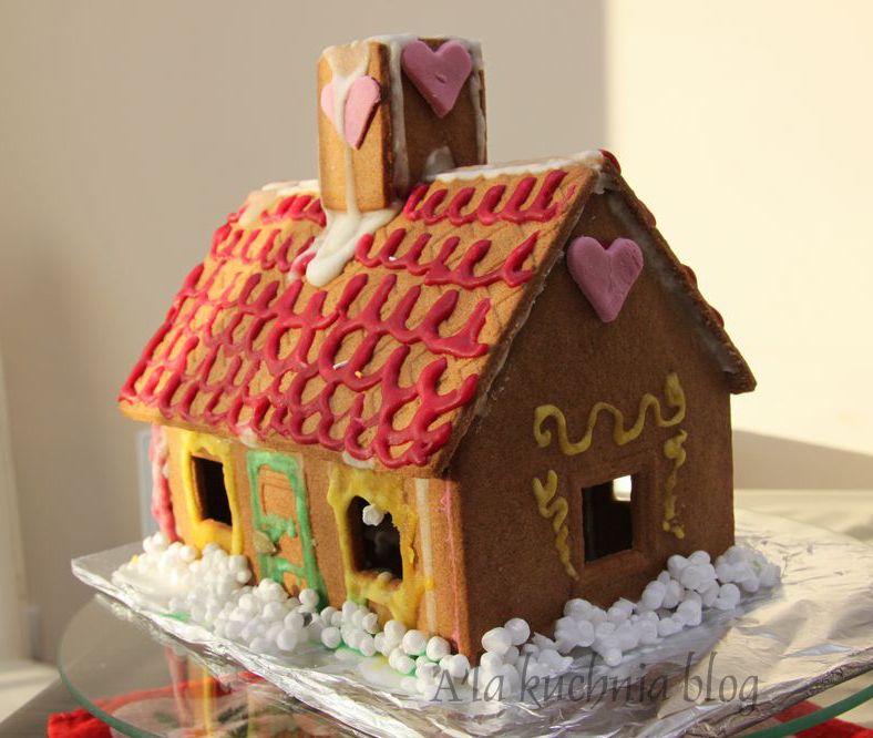 W garnuszku rozpuścić miód, dodać przyprawy do piernika - wymieszać. Następie dołożyć margarynę i cukier - chwilę podgrzewać. Masę przełożyć do miski, dodać jajko, mąkę i sodę - zagnieść jednolite ciasto. Ciasto owinąć folią aluminiową i wstawić do lodówki najlepiej na całą noc. Po wyjęciu rozwałkować ciasto na grubość ok 0,5 cm. Szablony przyłożyć do ciasta i powycinać poszczególne elementy (2xdach, 2xściana dłuższa, 2xściana krótsza domu, komin -4xscianka) - wyciąć okna. Ciasto pieczemy ok 15min w 180 st C. Ostudzone elementy domku w pierwszej kolejności dekorujemy zabarwionym lukrem - zostawiamy do zastygnięcia. Następnie poszczególne elementy sklejamy za pomocą gorącego karmelu (rozpuszczamy w garnuszku cukier z kilkoma łyżkami wody - stale mieszając gotujemy, aż cukier się rozpuści, tzn będziemy mieli przezroczystą masę).Sklejanie zaczynamy od ścianek domku, potem dach, a na końcu komin. Dobrze jest podeprzeć poszczególne elementy miseczkami lub pudełkami, żeby się nie "rozjechały" w trakcie zastygania karmelu.