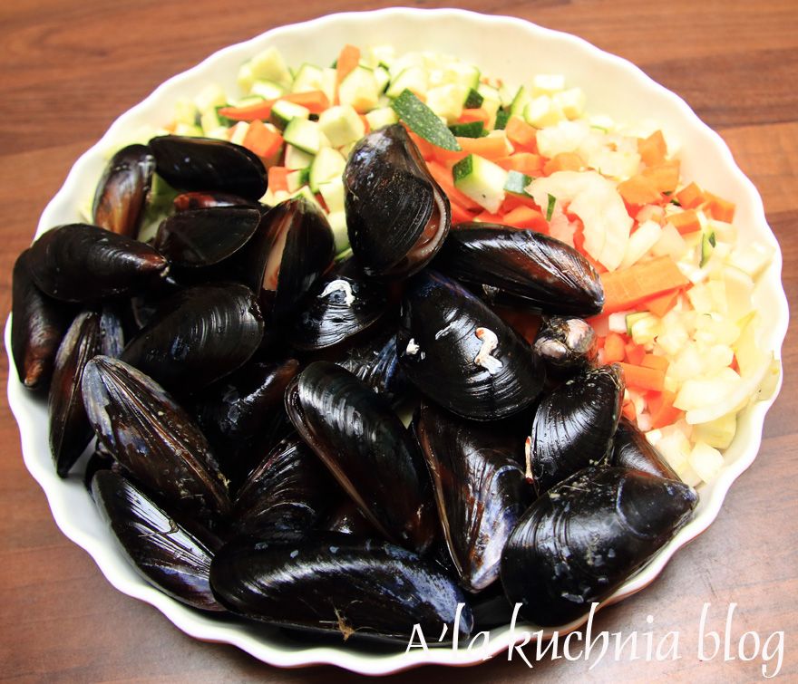 Warzywa myjemy, obieramy (oprócz cukinii) i kroimy w drobną kosteczkę. Wrzucamy pokrojone warzywa na rozgrzany olej i chwilę smażymy, doprawiając pieprzem i solą w trakcie smażenia. Wlewamy 200 ml wina białego i wrzucamy muszle. Garnek przykrywamy i gotujemy ok 7-10 minut na średnim ogniu (możemy podlać 50ml wody w trakcie duszenia).