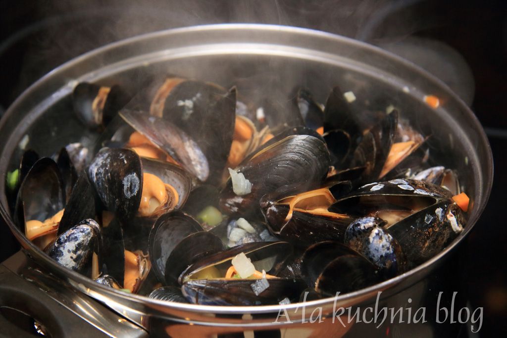 Jak muszle się otworzą , znaczy to, że są gotowe i dobre. Uwaga!!! Wyrzucamy muszle, które się nie otworzyły w czasie duszenia, gdyż oznacza to, że małża była nieświeża!!