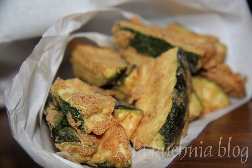 Cukinię smażymy w głębokim oleju na złoty kolor. Po wyjęciu z oleju osączamy na papierowym ręczniku przed podaniem.