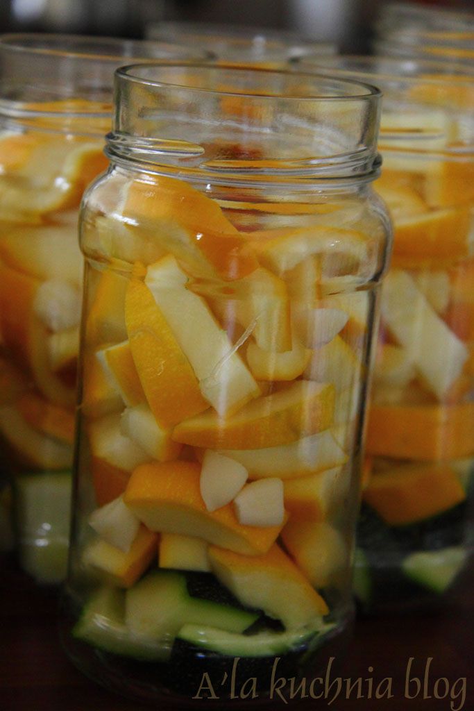 Zalewę zagotowujemy i wrzącą zalewamy cukinię z czosnkiem. Zakręcamy słoiki i pasteryzujemy w zakrytym garnku max 10 min. (garnek musi być z gorącą wodą, bo inaczej, ze względu na różnice w temperaturze, słoiki nam popękają). Wyciągamy i odstawiamy do góry nogami - na zakrętce do całkowitego ostygnięcia.