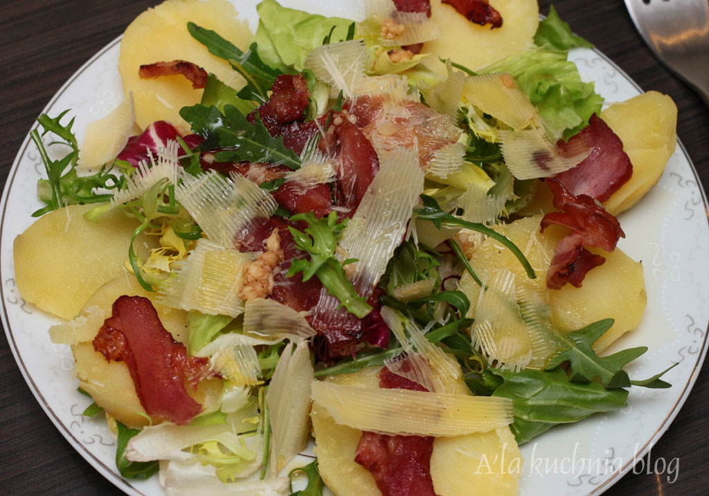 Sałaty myjemy i układamy na talerzu. Ziemniaki obieramy ze skórki i kroimy w plastry o ok. 4mm grubości – układamy na sałacie. Plastry boczku wytapiamy na patelni, aż będą rumiane i chrupiące – kroimy w grube pasy i posypujemy nimi sałatkę. Czosnek przeciskamy przez praskę, dodajemy oliwę i ocet, doprawiamy odrobiną soli, pieprzu i cukru a następnie dokładnie mieszamy. Sałatkę posypujemy startymi na wiórki parmezanem i polewamy sosem.