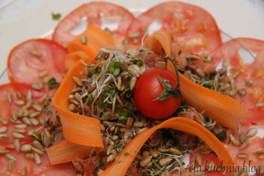 Za oknem mgła, szaro, buro... nic się nie chce robić.... mi na poprawę humoru pomogła kolorowa sałatka z marchewką, wędzonym łososiem, kiełkami i prażonym słonecznikiem. I wszystko nabrało barw...