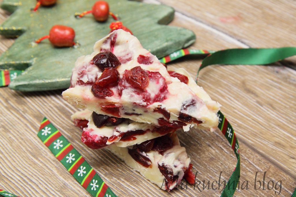 Ciąg dalszy „jadalnych prezentów” w mojej kuchni. Dziś proponuję Wam czekoladę białą z żurawiną w amaretto – w wersji dla dorosłych. Super pomysł na słodki prezencik.