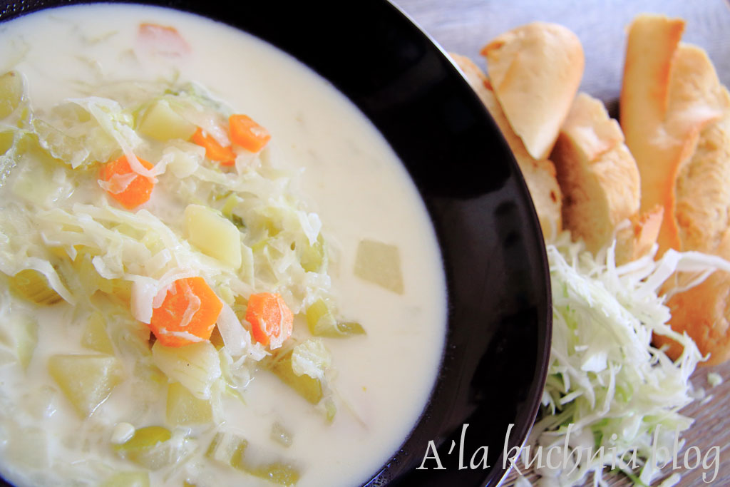 Zupy są moim ulubionym daniem. Kremy, buliony, warzywne, chłodniki.. nie ma znaczenia :D. Jesienią na naszym stole (obok dyni) często króluje kapusta pod różnymi postaciami. Pomimo że jest dostępna cały rok w sprzedaży, najbardziej pasuje mi do jesieni. To zdrowe warzywo, małokaloryczne, ale i sycące jednocześnie doskonale nadaje się do zup. Tym razem skusiłam się, z małą dozą niepewności, do kapuśniaku na mleku – kapuśniaku kanadyjskiego. Moje obawy były zbyteczne, zupa była bardzo smaczna!